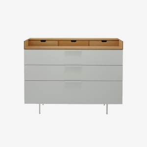 脚が細長く、天板トップとチェスト本体の美しいカラーコントラストが特徴の3段チェストです。トップには小さな小物入れが付いており、アクセサリーなどをしまうのに便利です。3段のチェストは深さの異なる2種類の引き出しを備え、収納するものに応じて使い分けられます。個性的で存在感のあるモダンなデザインながら、時代を超えて愛されるシンプルさも兼ね備えています。