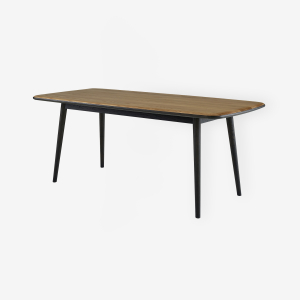 「テーブルは脚部とトレイの組み合わせ」というコンセプトを見事に表現したデザインのダイニングテーブルです。無垢のオーク材を使用し、天板のトップはナチュラルカラー、天板の裏側から脚部にかけてはブラックカラーを採用することで、天板と脚部が美しく融合しています。丸みを帯びた柔らかなカーブを描き、特に脚部は女性のハイヒールを思わせる細長いフォルムで、洗練されたデザインに仕上がっています。
