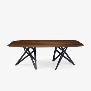 精巧な造りが際立つダイニングテーブルです。特徴的な脚部は、クリスタルを思わせる3つの三角形を組み合わせたデザインに仕上げています。脚はNO(ナチュラルオーク)とBKO(ブラックオーク)の2色からお選びいただけます。柔らかな印象の天板とシャープな脚部のデザインが調和し、エレガントな雰囲気を演出します。