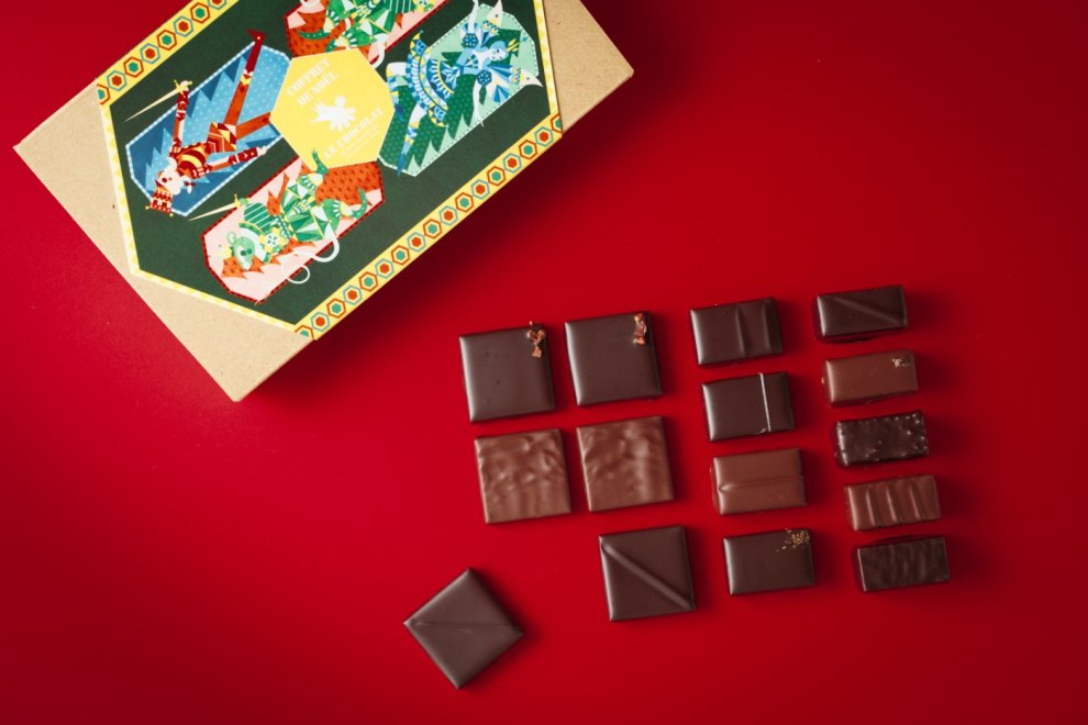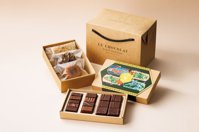 「ル・ショコラ・アラン・デュカス」のクリスマスコレクション、「コフレ・ド・ノエルと焼き菓子3個入り」。