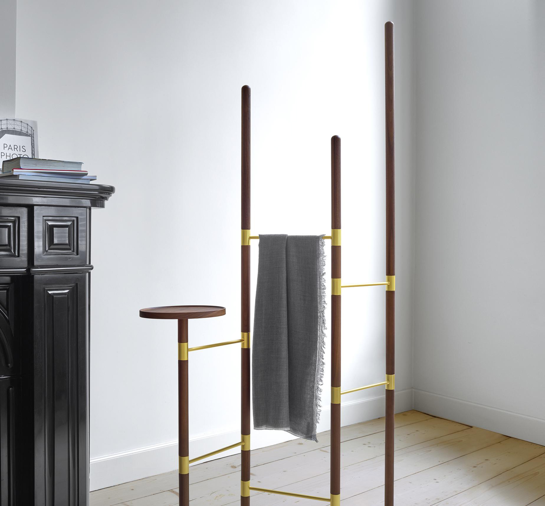 無垢材のウォールナットとゴールドのスチールバーで作られたコートラックです。ジャケットをラフにステムに掛け、ズボンをバーに掛け、財布などの小物をプレートの上に置けます。バーのゴールドがアクセントになり、ウォールナットが落ち着いた雰囲気を醸し出し、そこに掛けられた洋服と融合して1つのデザインになります。さらにレイアウトスペースに応じて形を変えることもできます。