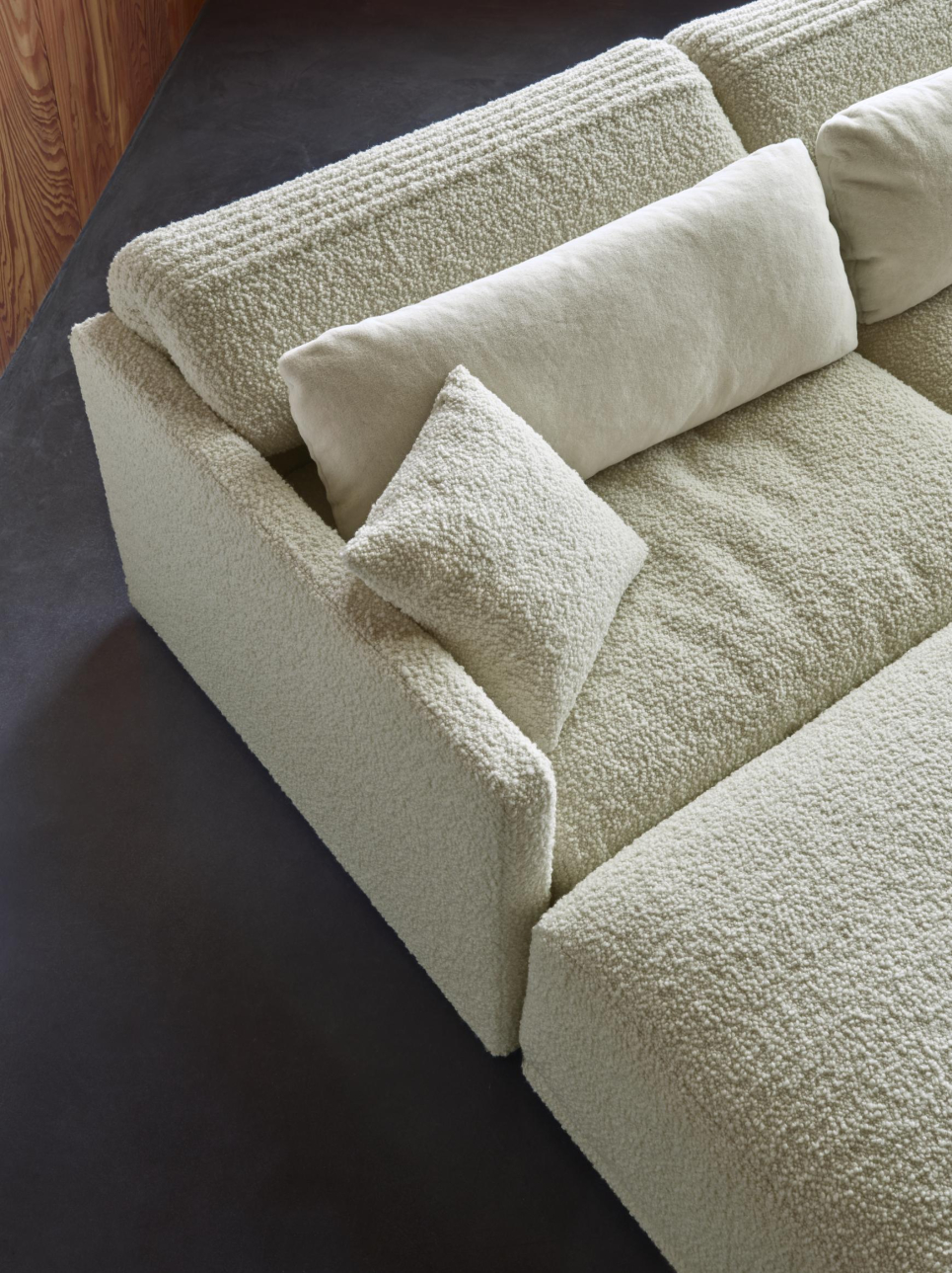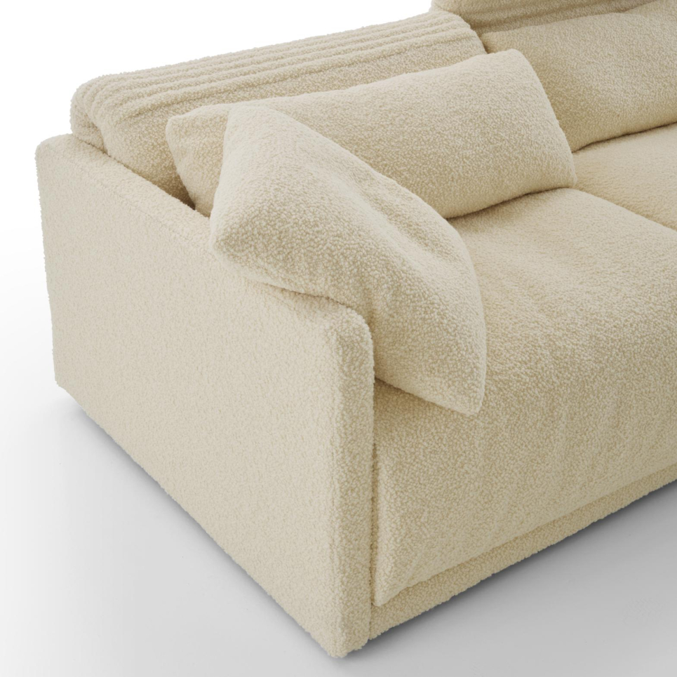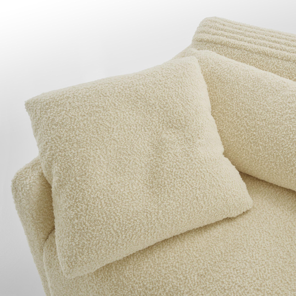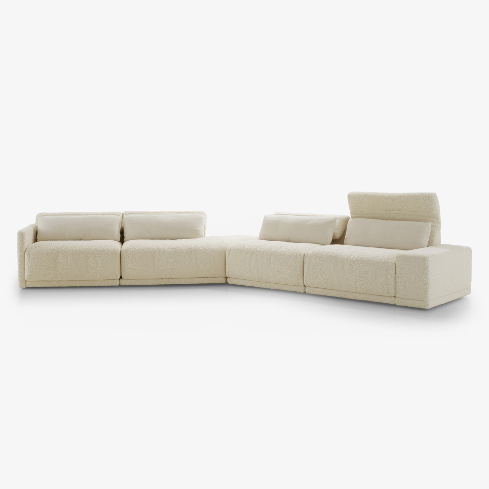 1人掛け、コーナー、パフの3つのアイテムを組み合わせて、さまざまなレイアウトが楽しめるモジュールソファです。座面の表面にはフェザーがたっぷりと敷き詰められ、包み込まれるような心地よさでリラックスできます。このソファのデザインの特徴は、ベローズのように美しい弧を描きながら角度を変えられる背もたれです。肘はハイタイプとロータイプから選べるほか、肘を付けずにレイアウトすることも可能です。さまざまなライフスタイルに合わせて組み合わせることができ、くつろぎのひとときを演出します。