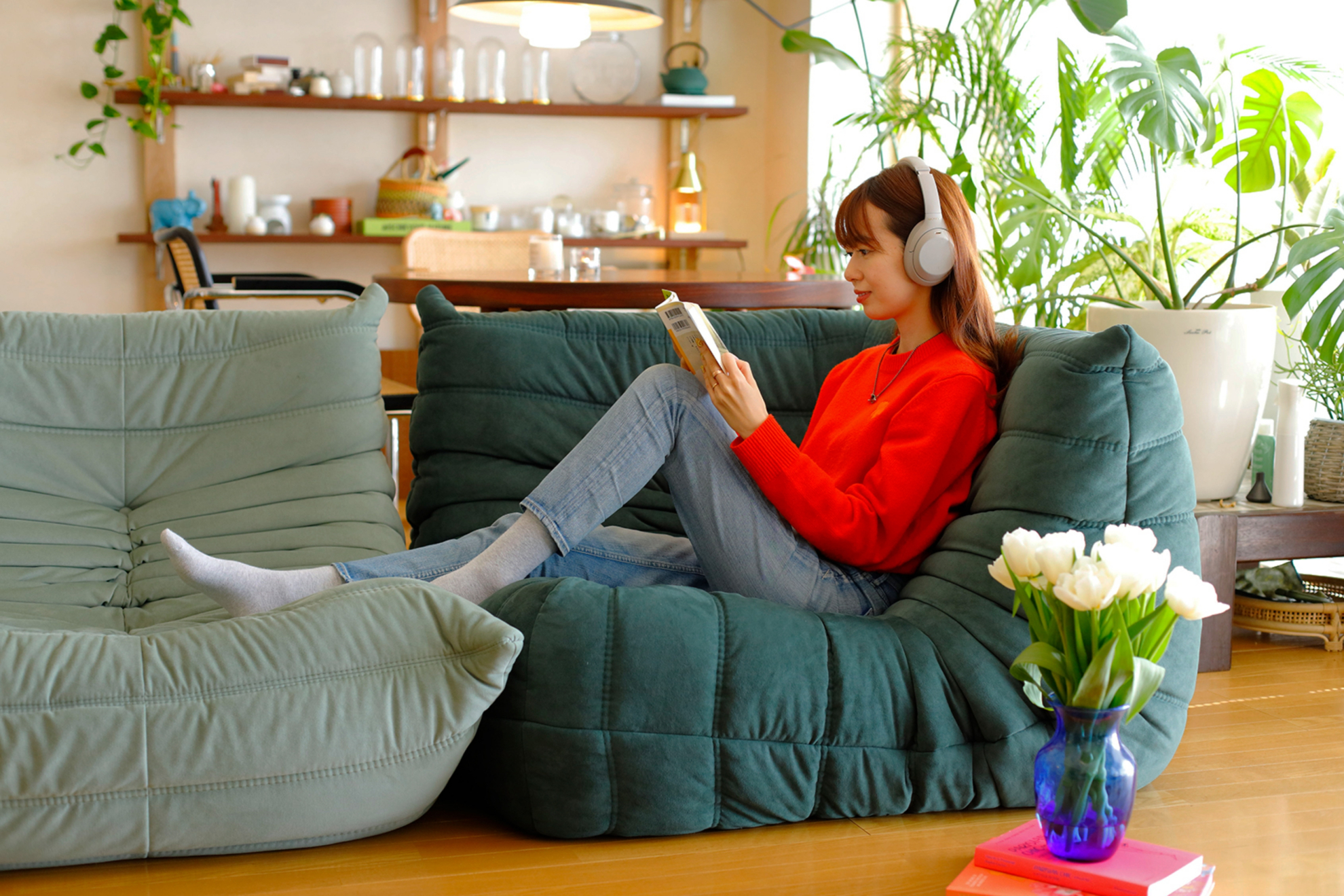 デスクで仕事をしていて、疲れて息抜きしたくなったらソファにという感じですね。ここに座って音楽を聴いたり、お香を焚いたり。ソファに包まれてのんびりと本を読むのが至福の時間です。同じ部屋にずっといると、オンとオフのメリハリがなくなってしまうけど、ちゃんと休める場所があるのがすごく快適です」