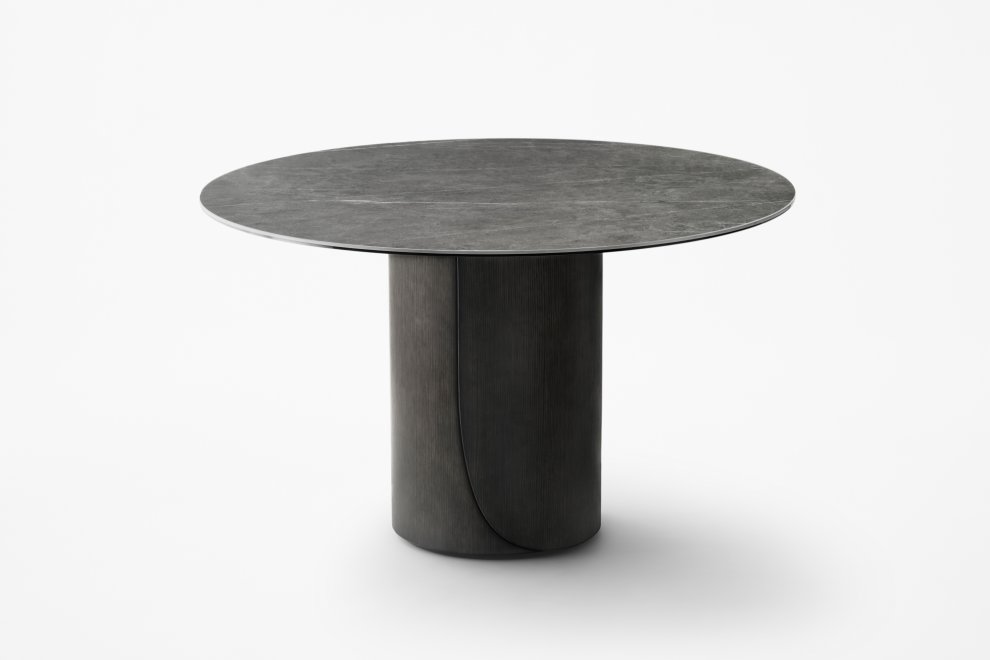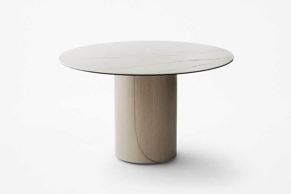 テーブルの天板には強度の高いセラミック、台座は木の突板仕上げとなっており、曲げた突板のエッジを薄くしつつ、僅かに浮かせて張り合わせることで、立体的な重なりを強調しています。カラーは、「ホワイトマーブル天板×ナチュラルオーク脚」と「グレー天板×ブラックオーク脚」の2色展開です。