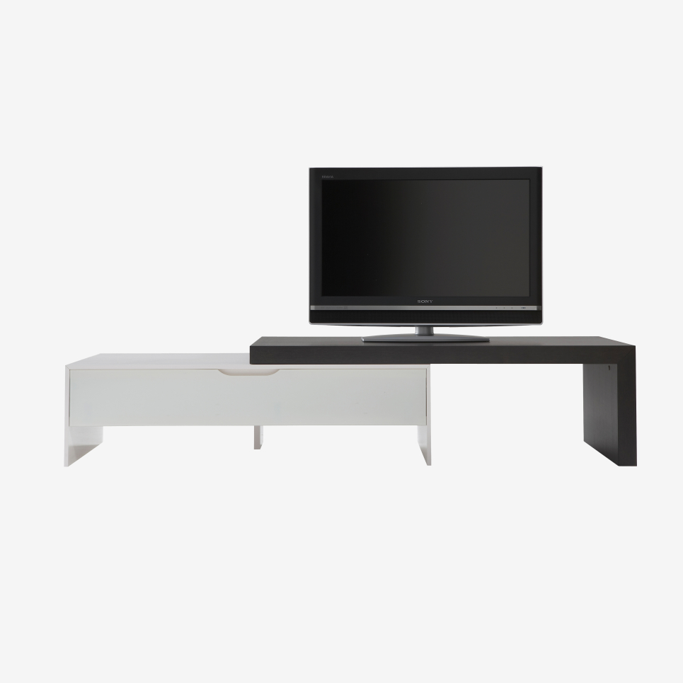 TVユニット(本体)とL字型天板を組み合わせて使用するテレビボードです。L字天板は本体に固定されていないため、お部屋のスペースやレイアウト、テレビのサイズに応じて自由に配置を変えることができます。本体に付いているガラス扉の中には、DVDやブルーレイデッキを収納可能。扉を開閉しなくても、リモコンの赤外線が通る仕様になっています。シンプルなデザインと構造ながら、斜めに切り込まれた角の形状が強度を高めており、最大で70kgまでの耐荷重があります。