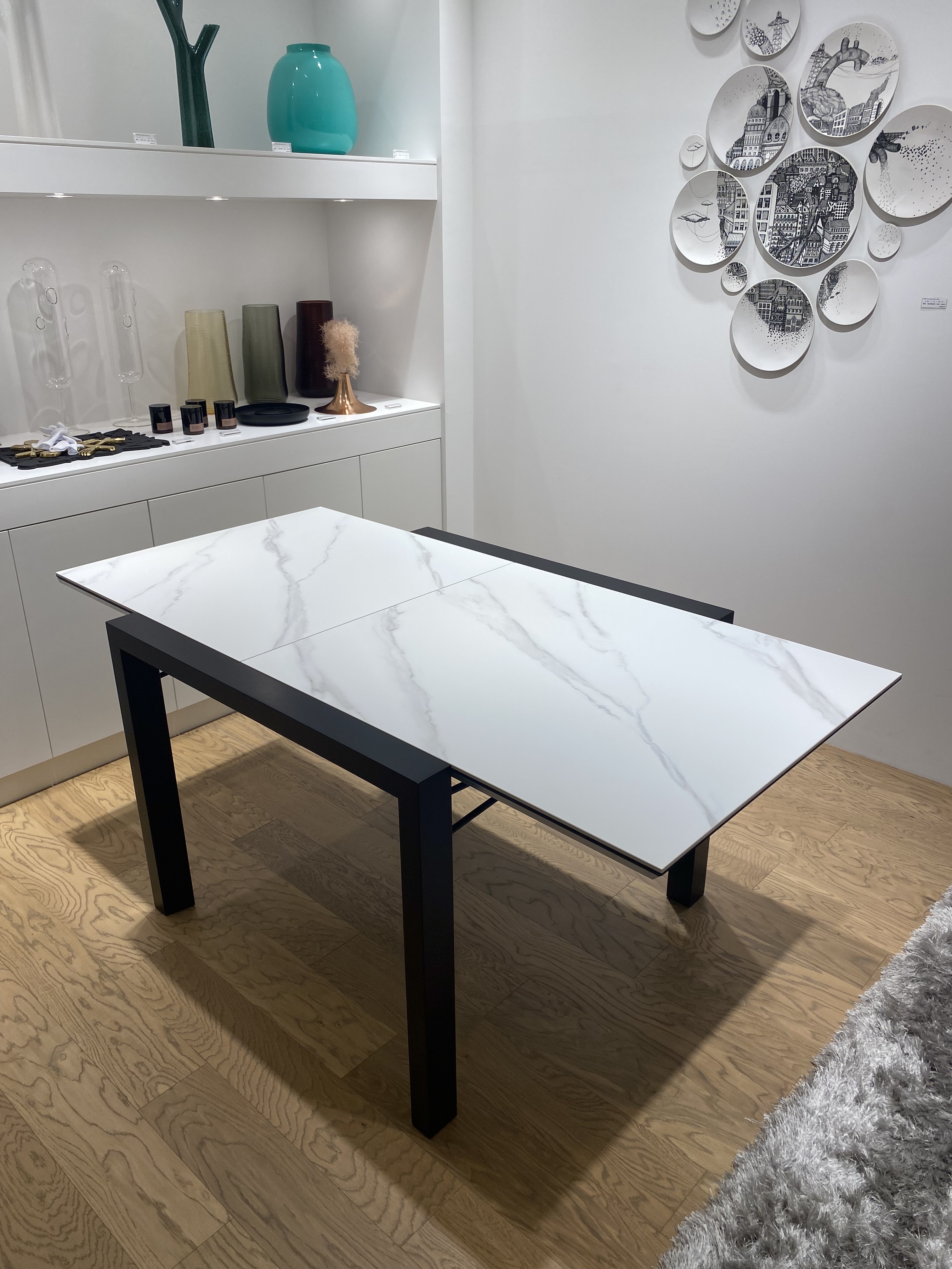 伸長式のダイニングテーブルです。2枚のセラミック天板がスライドし、上下に収納されます。脚のカラーをお選びいただけます。