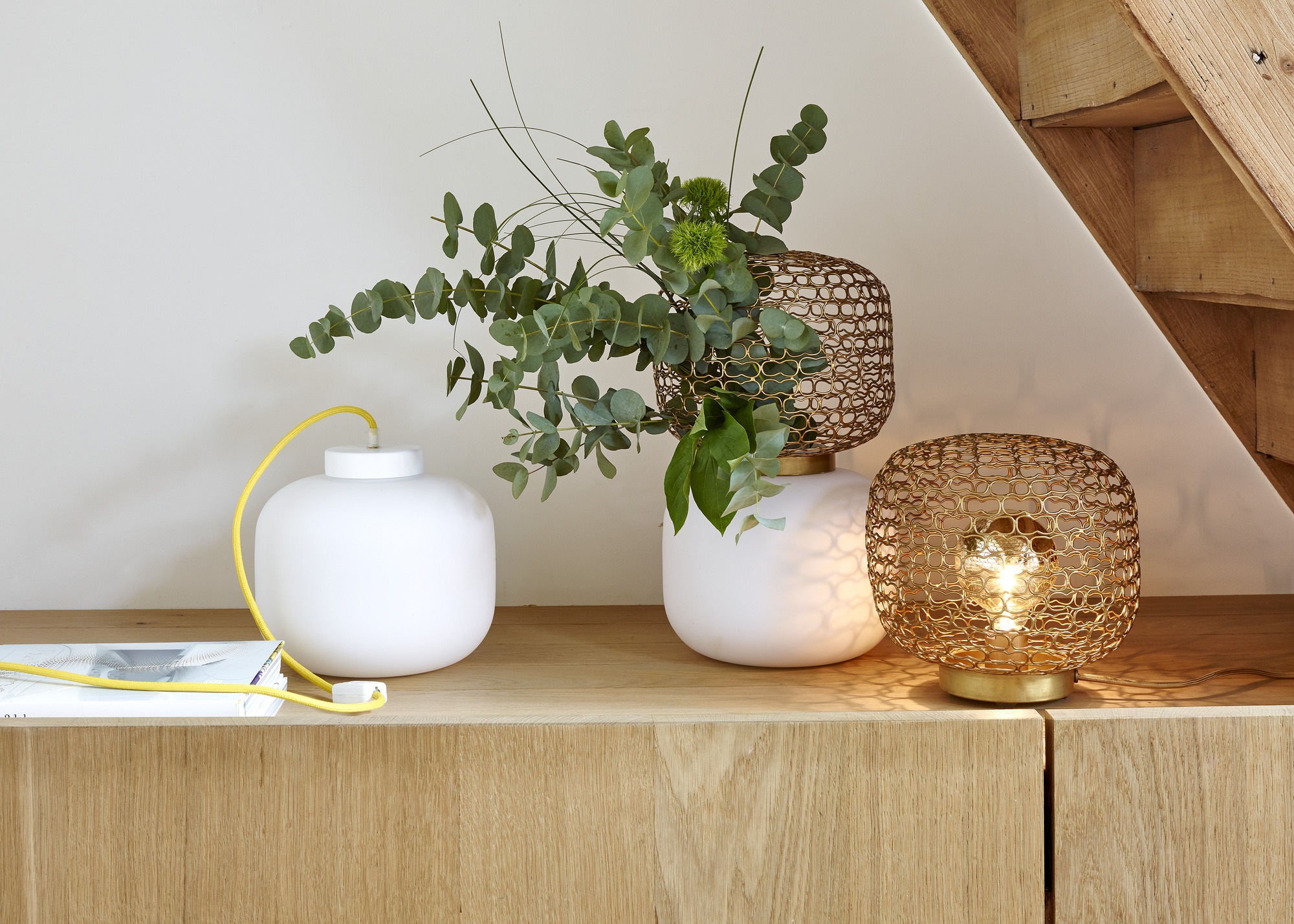 テーブルランプ「ロゼジャリー」は、ゴールド色のスチールメッシュシェードの中に電球を収め、そこから放たれる光が壁面にメッシュシェードの美しい影を映し出し、神秘的な雰囲気を生み出します。ゴールド色が空間の印象的なアクセントとなります。 日本で販売している本製品は、コードとソケットがブラック色で、スイッチはスライドタイプとなっております。(スライド画像の2枚目をご参照ください)