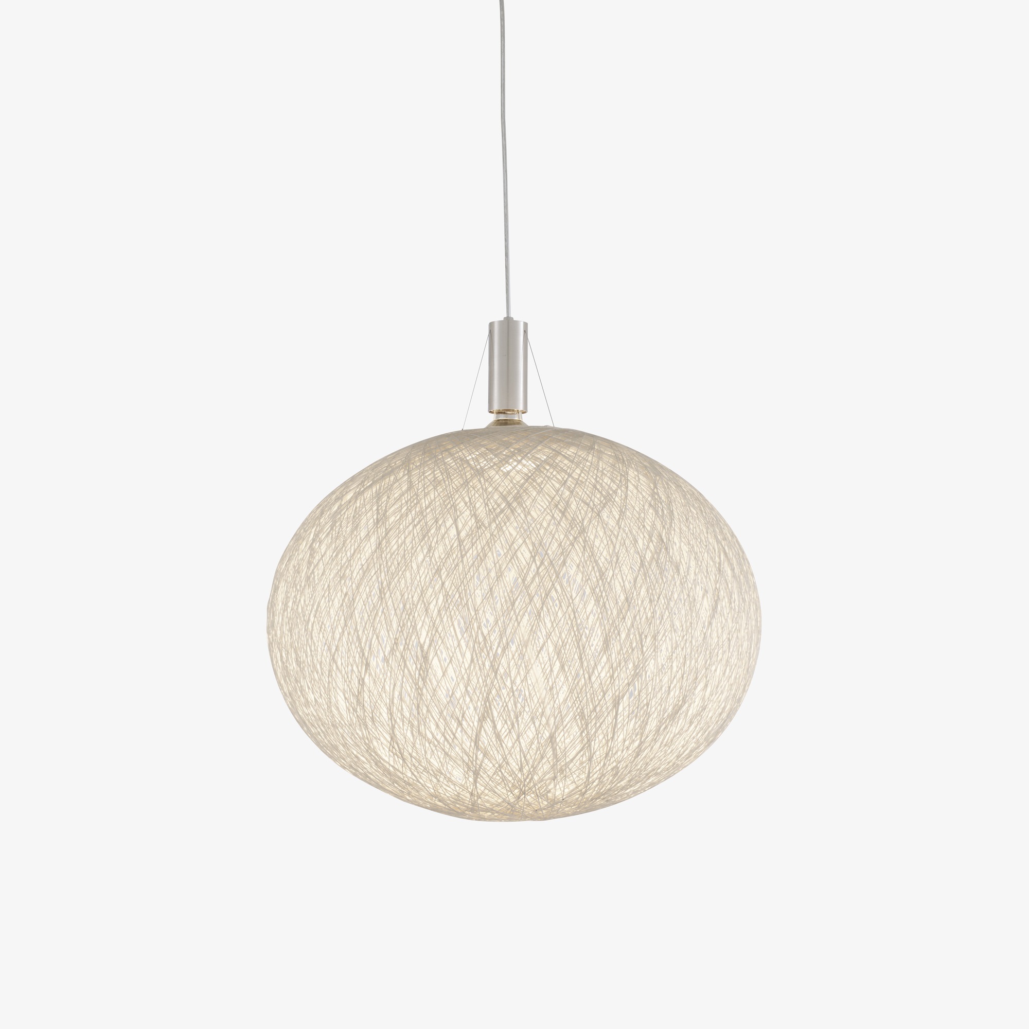 繊細なこのシェードは、紙をファイバー状に分解して線型を作り、透明なPVCで補強しています。それらをバルーン接着によって編み合わせ、丸いフォルムに仕上げています。1つ1つ職人の手作業でつくられるため、同じ商品でも形状にはわずかな個体差があります。デザイナーのコンセプトは「庭」。白く丸いこのペンダントランプは、まるで部屋の中に雲がふわふわと浮いているような雰囲気を醸し出します。