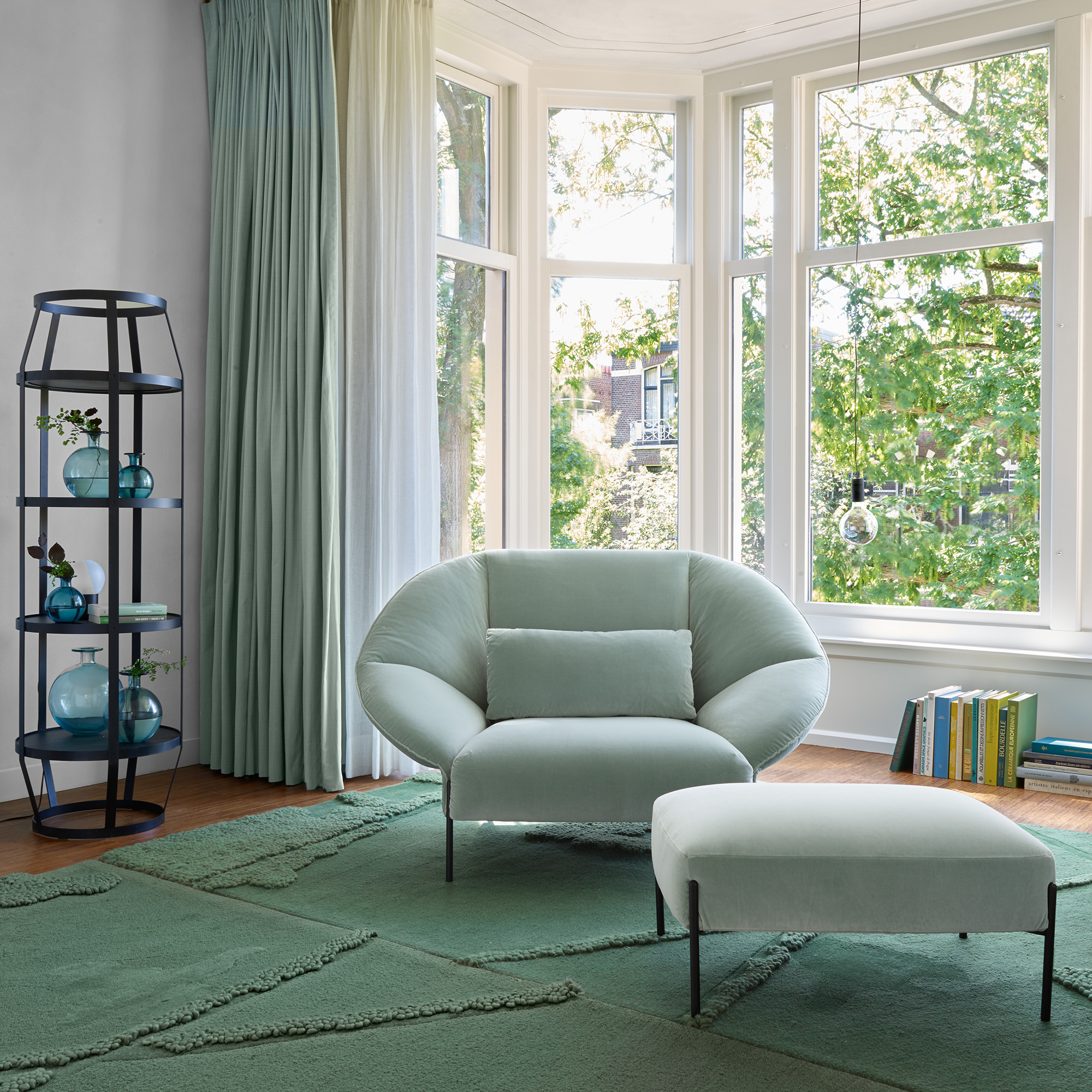 PAIPAIという名前は、丸みを帯びた特徴的な形状を持つ「扇」に由来していますが、デザイナーは”蝶”をモチーフにこのソファをデザインしました。その思いやこだわりは、特に背からアームにかけてのラインに表現されています。印象的なアームはデザイン性だけでなく、気軽にもたれかかっても快適に受け止めてくれるほど、高い耐荷重性を備えています。「自由な座り方でくつろげる時間を提供したい」という思いと、「どんなスペースでも視覚的に美しくレイアウトできるようにしたい」という考えが、このデザインに込められています。また、サイズ感にもこだわりがあり、全体としては大きめの設計ですが、アームを除いた座面部分はコンパクトに設計されています。これは、背だけでなくアームにも上半身をゆだね、インフォーマルな姿勢でくつろいでもらいたいとデザイナーが考えているからです。座る人の体格によっても快適さの感じ方が異なるため、奥行きを調整できるランバークッションも付属しています。大きなソファを、あえて非常に細い脚で支えることで、全体をシンプルで軽やかな印象に仕上げている点も、優れたデザイナーならではの発想です。