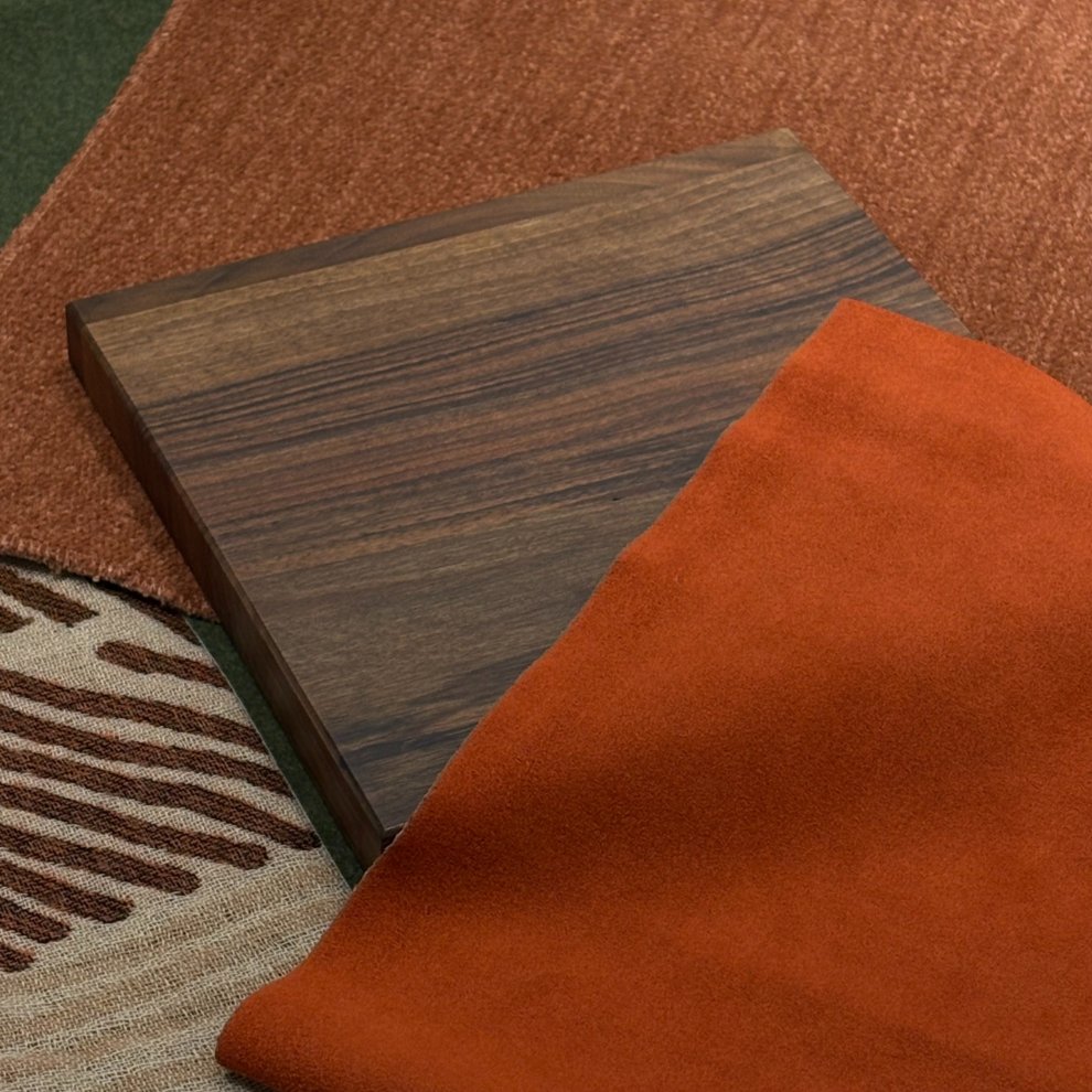 ウォールナットの持つ高級感と、テラコッタの温かみのある赤が互いを引き立て合い、温かみと深みのある洗練された、落ち着きのある雰囲気を生み出します。